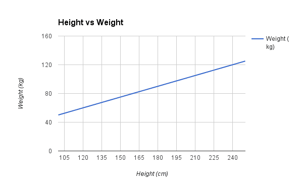 Bạn có thể thấy rằng phương trình trên có thể được vẽ dưới dạng một đường trong hai chiều. B0 là điểm xuất phát của chúng ta bất kể độ cao của chúng ta là bao nhiêu. Chúng ta có thể chạy qua một loạt các độ cao từ 100 đến 250 cm và cắm chúng vào phương trình và nhận các giá trị trọng lượng, tạo ra đường thẳng của chúng ta.