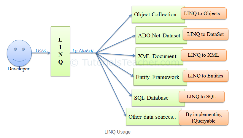 Ví dụ: SQL là Ngôn ngữ truy vấn có cấu trúc được sử dụng để lưu và truy xuất dữ liệu từ cơ sở dữ liệu. Theo cùng một cách, LINQ là một cú pháp truy vấn có cấu trúc được xây dựng trong C # và VB.NET để lấy dữ liệu từ các loại nguồn dữ liệu khác nhau, chẳng hạn như bộ sưu tập, ADO.Net Dataset, XML Docs, dịch vụ web và MS SQL Server và các cơ sở dữ liệu khác.