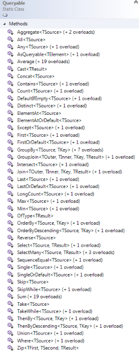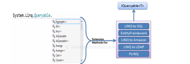 Hình dưới đây cho thấy các phương thức mở rộng có sẵn trong lớp Truy vấn có thể được sử dụng với các nhà cung cấp dữ liệu gốc hoặc bên thứ ba khác nhau.