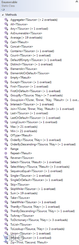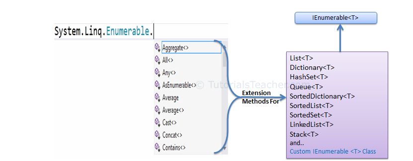 Hình dưới đây cho thấy các phương thức mở rộng được bao gồm trong lớp Enumerable có thể được sử dụng với các bộ sưu tập chung trong C # hoặc VB.Net.