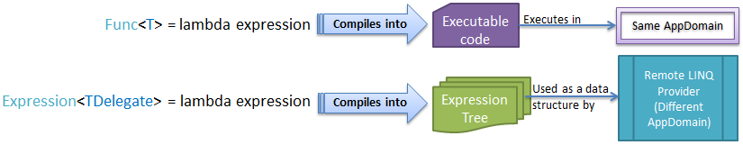 Chúng ta đã biết rằng biểu thức lambda có thể được gán cho kiểu ủy nhiêm Func hoăc Action để sử lý trong bộ nhớ collection. Trình biên dịch .NET chuyển đổi biểu thức được gán cho Func hoặc Action thành mã thực thi tại thời gian biên dịch. Linq giơi thiệu một loại mới có tên gọi là Expression đại diện cho biểu thức lambda mạnh mẽ. Nó có nghĩa là biểu thức lambda cũng có thể được gán cho loại Expression<TDelegate>. Trình biên dich .NET chuyển đổi biểu thức lambda được gán cho biểu thức Expression<TDelegate> thành một cây biểu thức Expression thay vì mã thực thi. Cây biểu thức này được sử dụng để Linq truy vấn từ xa cấu trúc dữ liệu, xây dựng một truy vấn thời gian chạy từ nó (như Linq-to-Sql, entity framework hoặc bất ky một truy vấn Linq nào khác mà có interface là IQueryable<T>. Hình minh họa dưới đây mình họa cho sự khác biệt khi biểu thức lambda được gán cho ủy nhiêm Func hoặc Action và Expression trong Linq.
