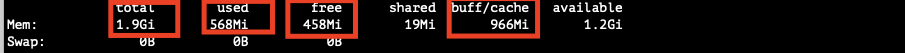Số RAM trống tuy chỉ bằng 458 MB (free) nhưng thực tế bạn có thể sử dụng nhiều hơn thế. Tổng số bộ nhớ có thể sử dụng sẽ bằng free + buff/cache. Vậy ở đây, số RAM thực sự có thể sử dụng được sẽ bằng 1.424GB.