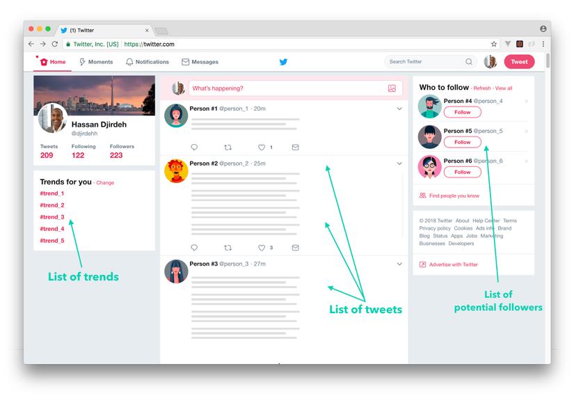 Đây là vài phần trong mạng xã hội twitter cũng được sử dụng vòng lặp để in ra một danh sách. (ảnh mạng)
