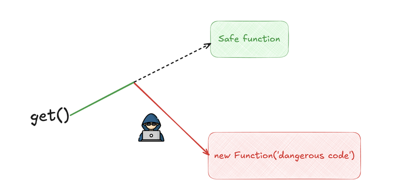 .get). Anh công nhân React đinh ninh ấn nút đó sẽ ra hàng hóa. - Thực tế: Hacker đã đấu dây lại nút màu xanh đó nối thẳng vào "Nút tự huỷ của nhà máy" (Function Constructor).