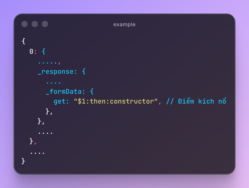 blob đã kích hoạt dòng code _formData.get(). Đây chính là cái bẫy để dụ React thực thi hàm .get mà hắn sắp đánh tráo.Sau đó hacker đã thay thế hàm .get vô hại bằng cái constructor tử thần vừa tìm thấy ở trên (Payload: get: "$1:then:constructor")