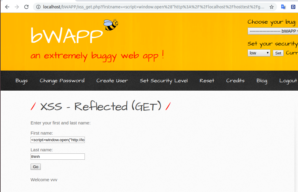 Tếp theo chọn phần khai thác lỗ hổng XSS - Reflected (GET)