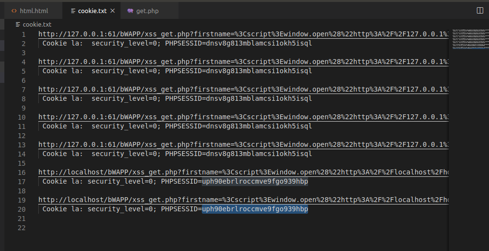 đoạn mã trên gọi đến host của mình đã tạo file get.php , file này sẽ lưu lại cookie