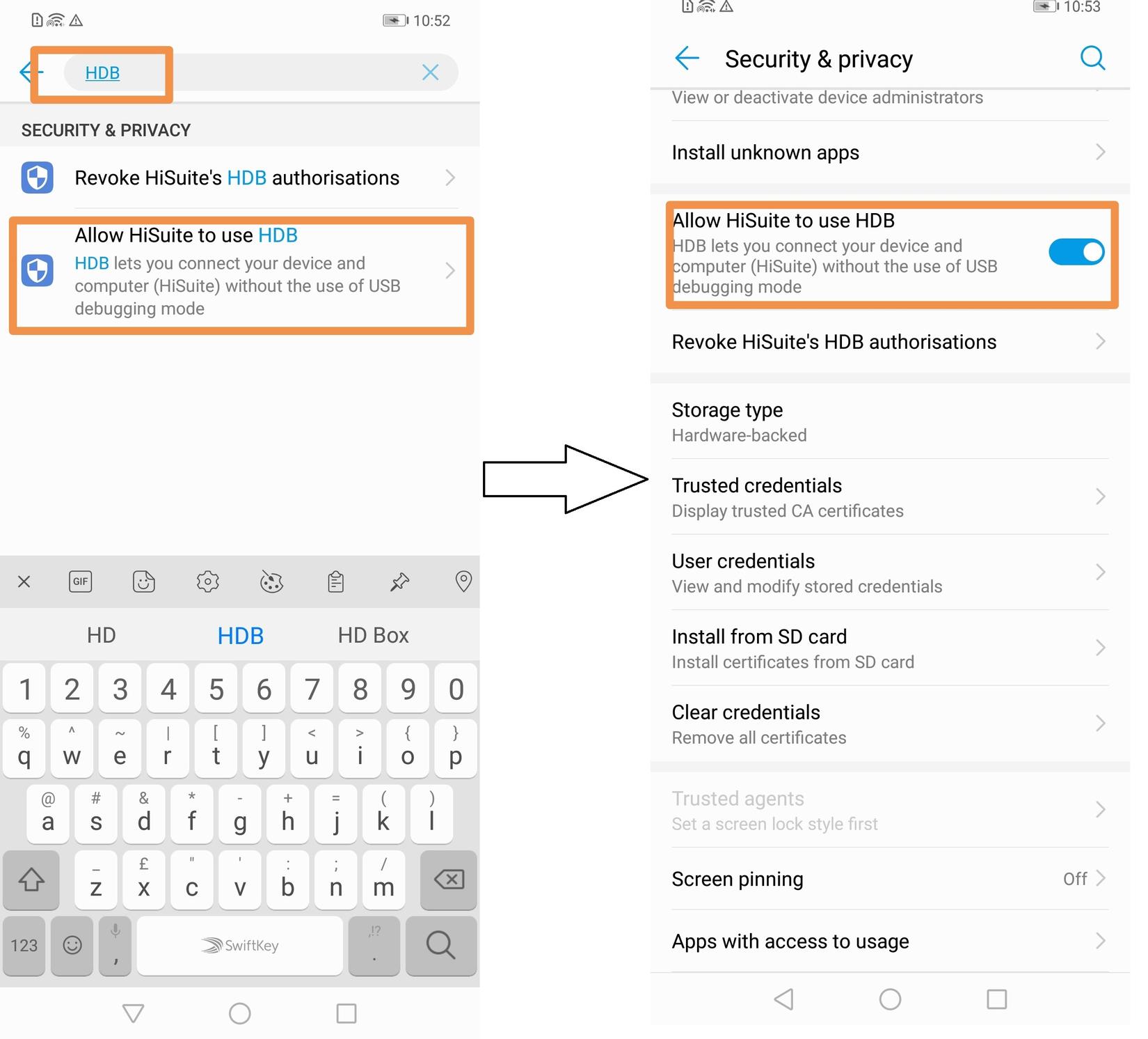 2/ Trên device Huawei các bạn vào Setting -> Search từ khóa HDB -> Chọn Allow HiSuite to use HDB -> Nhấn ON tại Allow HiSuite to use HDB như hình ảnh dưới đây