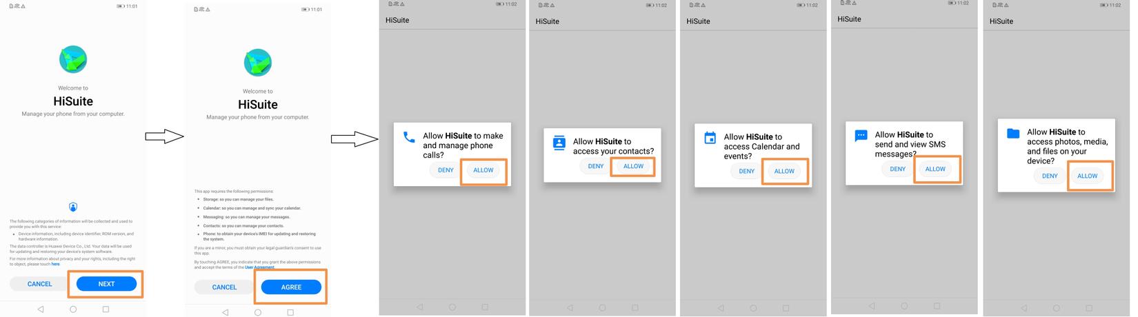 Bật HiSuite đã được cài đặt trên điện thoại lên chọn next ->agree -> allow (5 lần) ( một lưu ý nho nhỏ đoạn này bạn cũng có thể chọn DENY nhé)