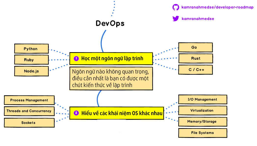 Bây giờ hỏi thì 9 trên 10 ông làm việc với Linux nên mình nghĩ chúng ta nên học về Linux OS. DevOps cần nắm rõ được những command ở terminal nên chúng ta cũng cần phải đầu tư thời gian để nắm rõ các sử dụng các Linux shells như Bash hay Zsh cùng với các tool như find, grep, sed, isof, và những command networking như NSlookup và netstat.