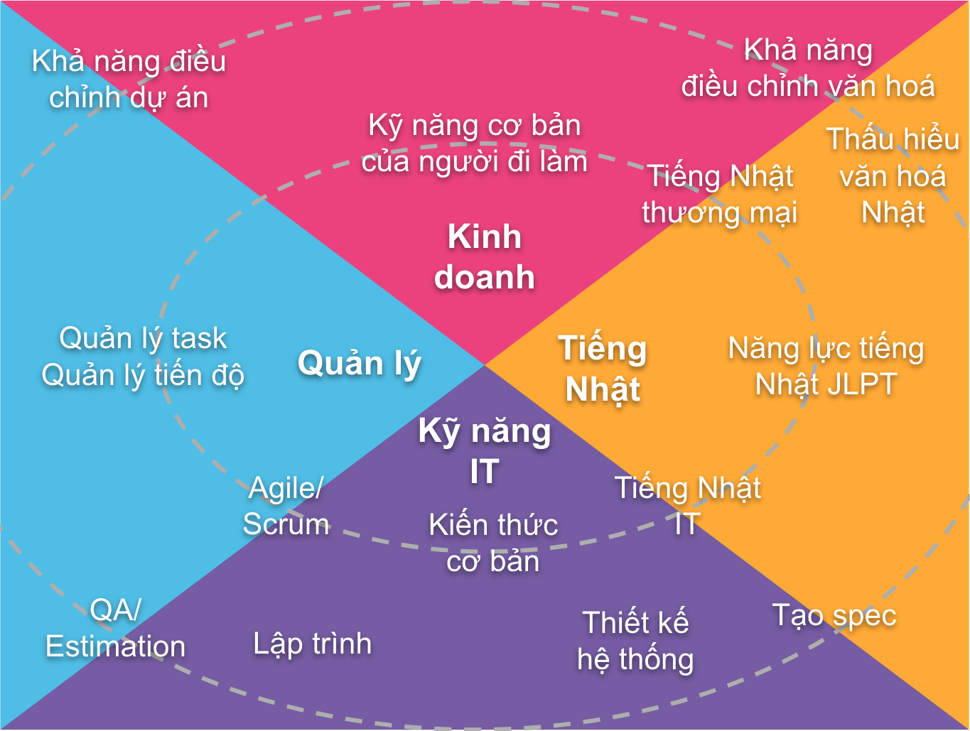 Để trở thành một kỹ sư cầu nối, bạn sẽ cần 4 vùng kỹ năng cốt lõi: Tiếng Nhật, Kỹ năng IT, Kỹ năng Quản lý, Kiến thức và kỹ năng về thương mại (business) giống như 4 vùng màu sắc khác nhau trong hình chữ nhật trên. Các vòng elip nét đứt là tập hợp các kỹ năng xoay quanh 4 lõi này, các kỹ năng cùng trên một vòng elip tức là có cùng một mức độ. Theo đó, càng đi xa khỏi tâm hình chữ nhật, các mức độ kỹ năng sẽ càng cao lên, tương đương với cấp độ của BrSE càng cao, thành thạo.