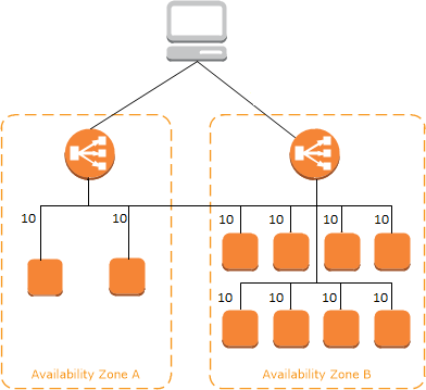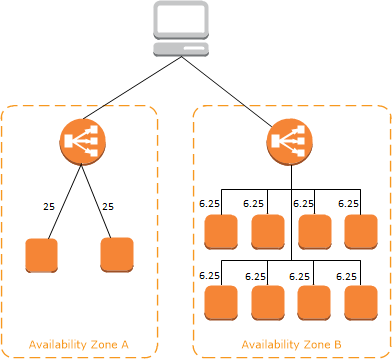 - Trong khi đó mỗi target trong tám target của Availability Zone B chỉ nhận được 6.25% lưu lượng.