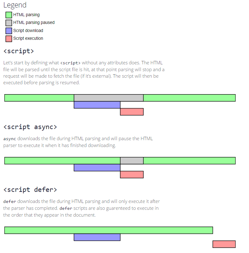 async: Khi script load thì quá trình parse html vẫn diễn ra song song, chỉ đến khi Execute script thì parse html mới tạm dừng. Execute script sẽ thực hiện ngay sau khi việc download script hoàn thành. Do vậy quá trình thực thi sẽ không theo thứ tự load. Nên dùng trong trường hợp script không phụ thuộc vào các lib hay thành phần khác.defer: Khi script load thì quá trình parse html vẫn diễn ra song song, chỉ đến khi parse html hoàn thành thì Execute script mới chạy. Như vậy việc dùngdeferthì parse html không phải tạm dừng. Execute script ở đây sẽ theo thứ tự load script. Nên dùng khi script phụ thuộc vào script hoặc các thành phần khác và ngược lại.
