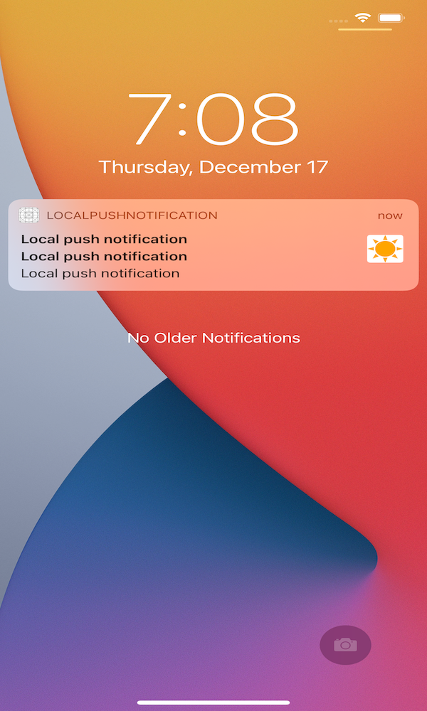 Build và run ứng dụng, Click vào Send Local push notification và chờ kết quả.