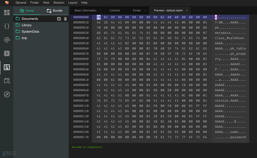 Để đọc được dữ liệu trong Realm DB cần sử dụng phần mềm riêng tên là Realm Browser, không thể đọc dữ liệu trong Realm DB trên phần mềm GrapeFruit được. Người dùng MacOS có thể tải trực tiếp phần mềm này qua App Store.