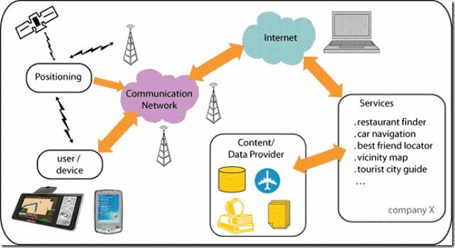 LBS hoạt động dựa trên sự kết hợp của nhiều công nghệ: Internet – Hệ thống thông tin địa lý (Geographic Information System) – Thiết bị di động (Mobile devices)