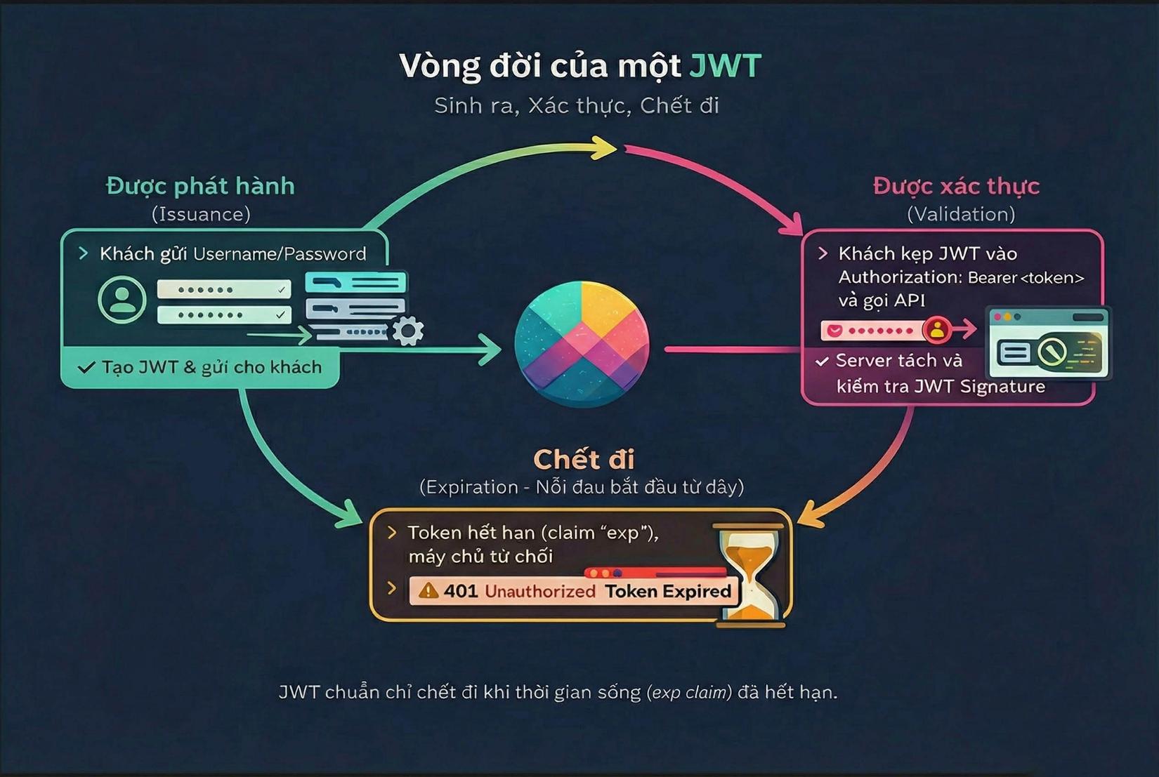 Để làm chủ JWT, chúng ta phải nhìn nó dưới góc độ một vòng đời khép kín: Sinh ra, Xác thực và Chết đi.