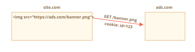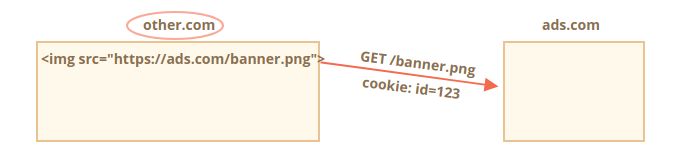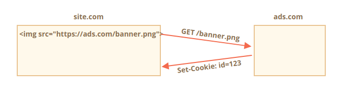 site.comsang một trang khácother.comcũng có banner, sau đóads.comlấy cookie, vì nó thuộc vềads.com, do đó nhận ra khách truy cập và theo dõi anh ta khi anh ta di chuyển giữa các trang web: