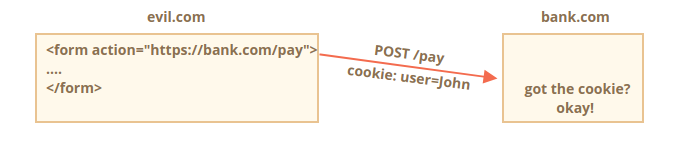 Bây giờ, khi duyệt web trong một cửa sổ khác, bạn vô tình đến một trang web khác evil.com. Trang web đó có javaScript code gửi form <form action = "https://bank.com/pay"> tới bank.com và bắt đầu giao dịch vào tài khoản hacker .