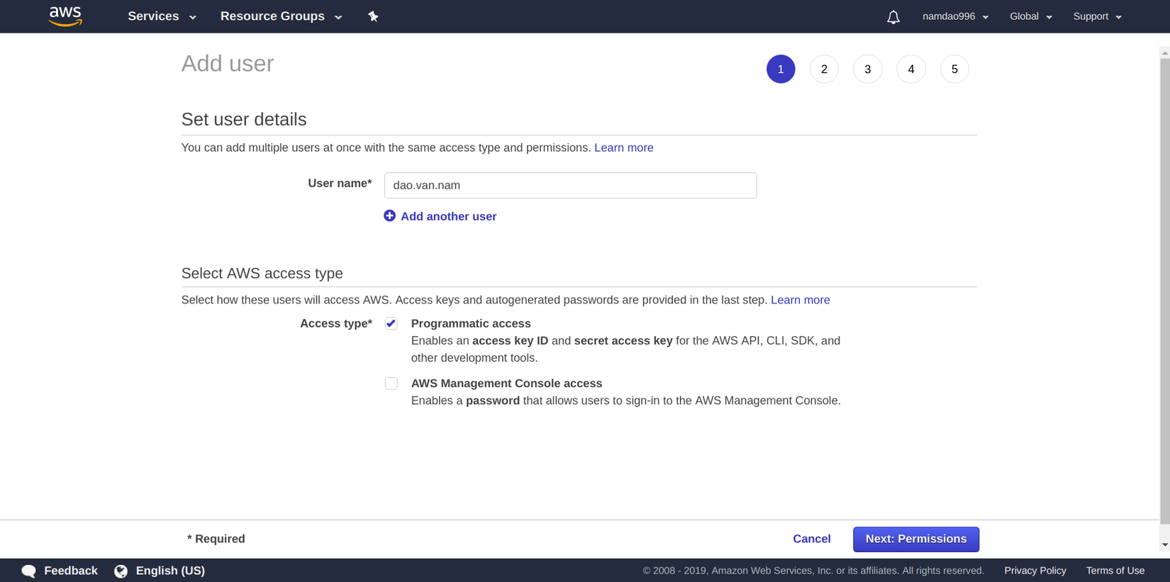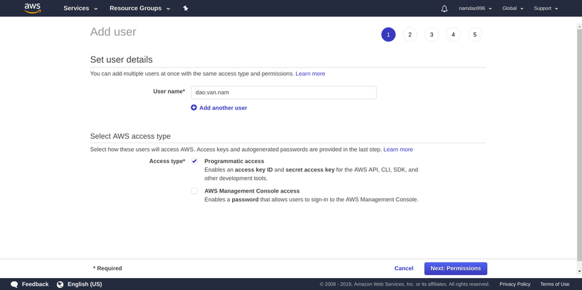 Click vào add user. Mình sẽ tạo 1 user mới là dao.van.nam. Và user này mình chỉ cho quyền sử dụng access key id và secret để truy cập. Không cho phép đăng nhập.