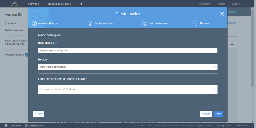 MÌnh đã tạo được 1 bucket với name là deploy-app-development, region mình chọn Singapore(ap-southeast-1) và để lấy được region name thì các bạn có thể check ở đây.