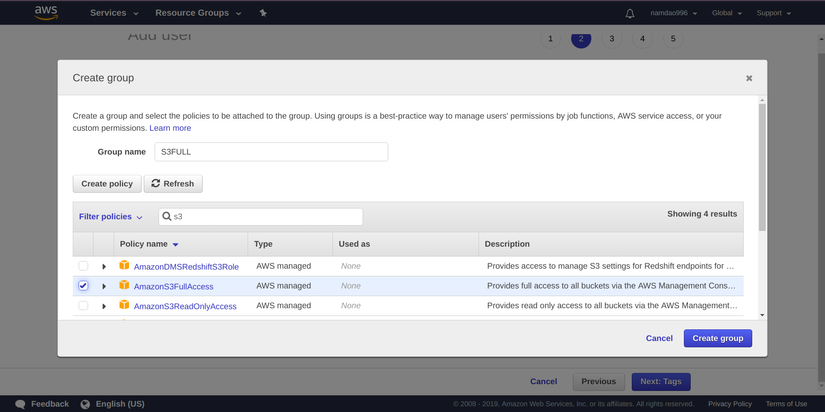Group này thì mình đang sử dụng s3 để lưu trữ. Mình sẽ cấp quyền S3FullAccess.