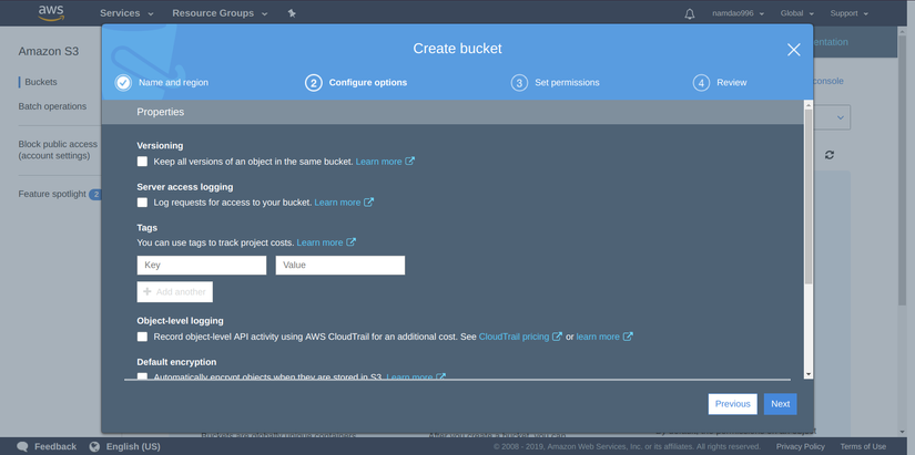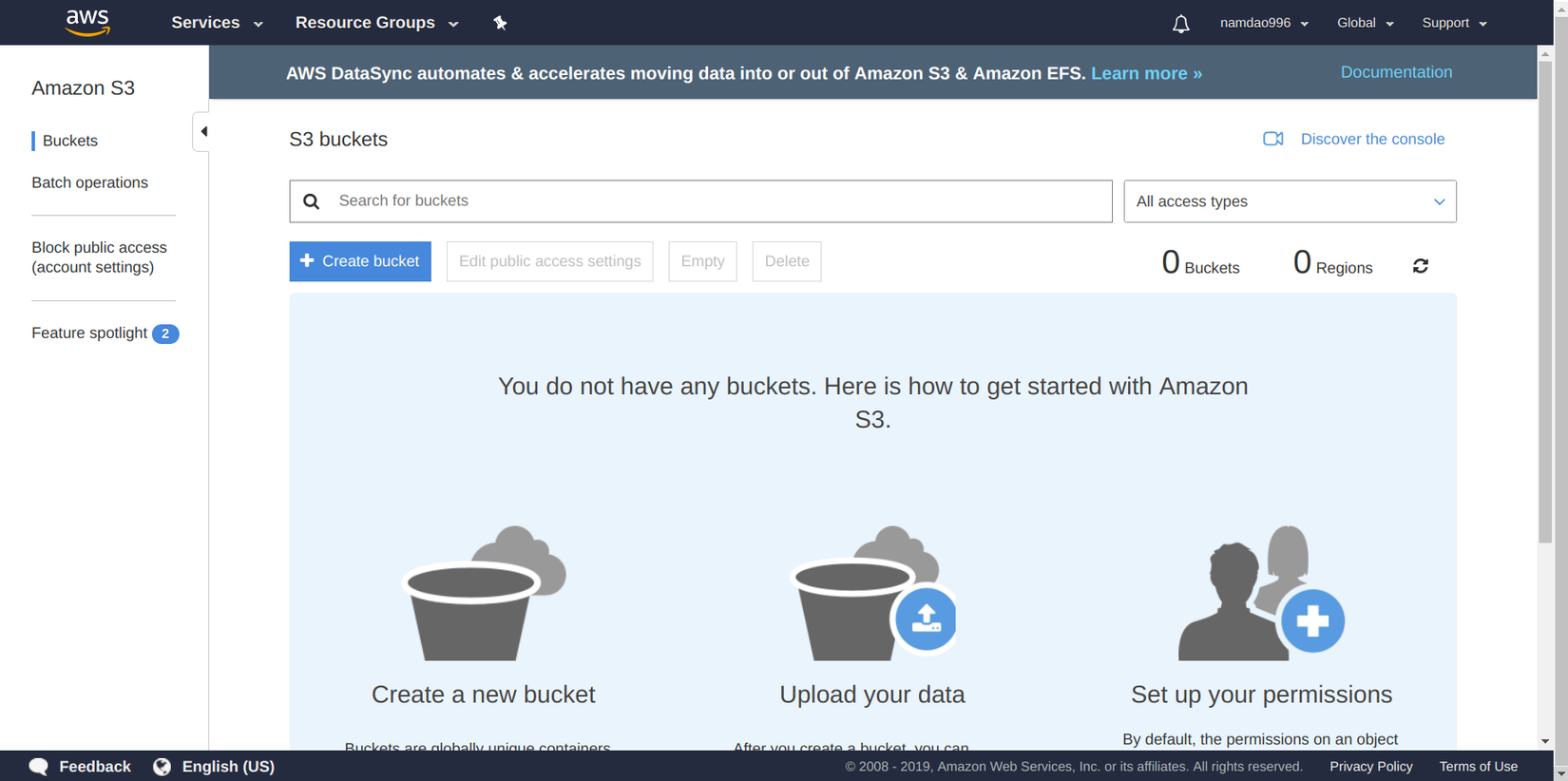 Đầu tiên thì chúng ta sẽ truy cập vào trang amazon s3 để tạo 1 bucket. Nó cũng giống như folder. Và mình sẽ lưu trữ dữ liệu ở bucket này.