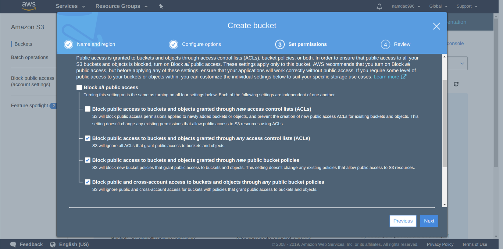 Ở phần cuối thì bỏ chọn phần Block public access to buckets and objects granted through new access control lists (ACLs) để server của chúng ta có thể access vào bucket này.