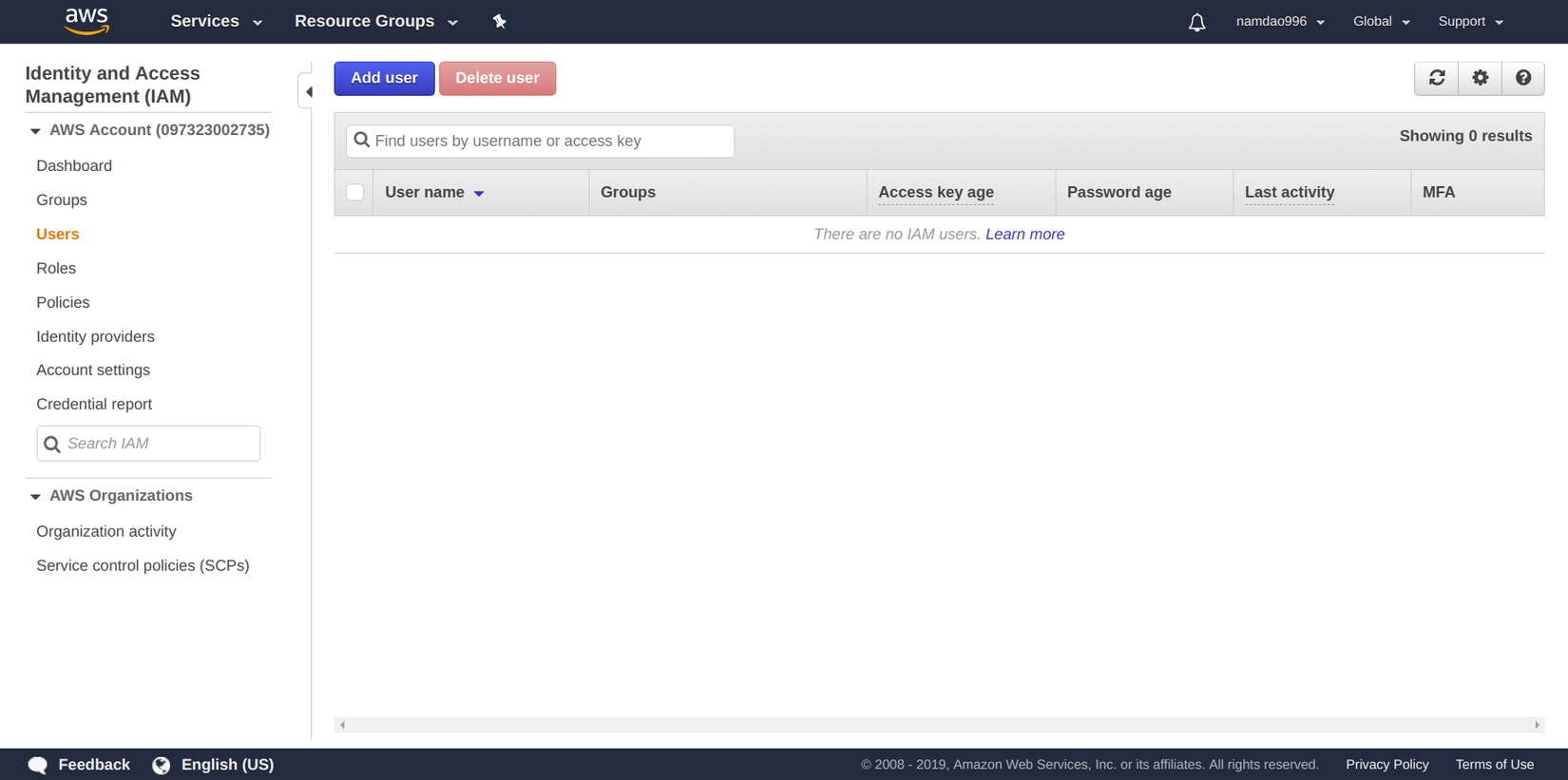 Đầu tiên thì chúng ta sẽ tạo user ở trang này: https://console.aws.amazon.com/iam/home?#/users