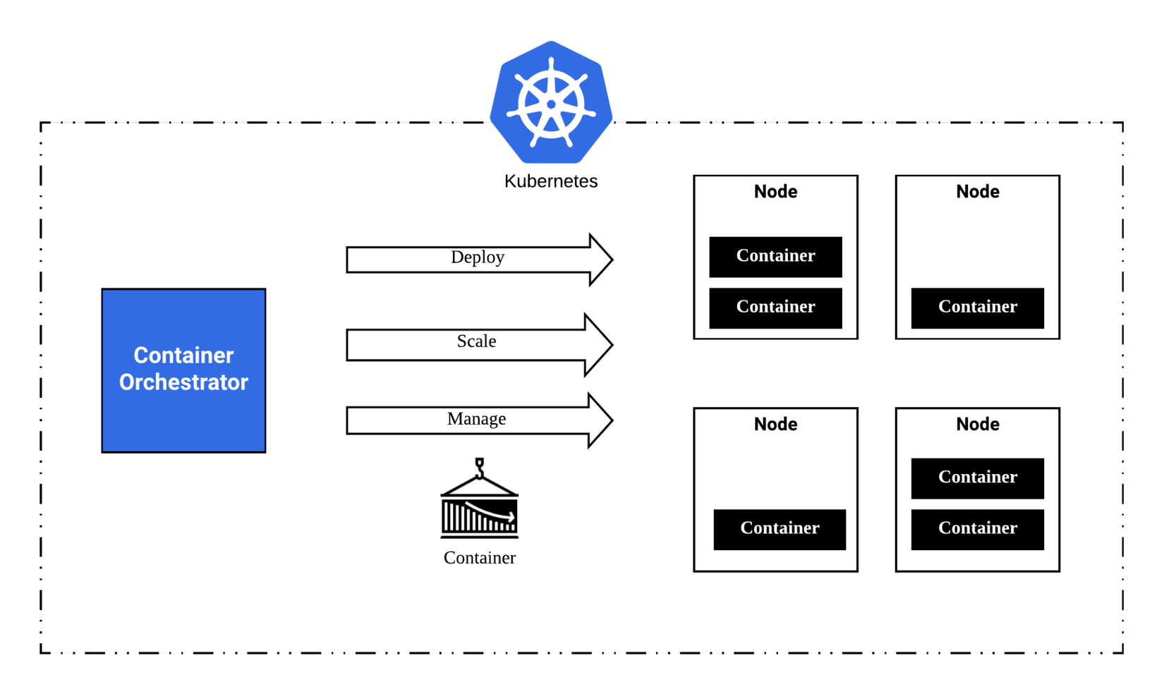 Trách nhiệm chính của Kubernetes là container orchestration (dịch ra có nghĩa điều phối container). Kubernetes đảm bảo rằng tất cả container được lên lịch chạy trên các server (server ở đây có thể là physical machine hoặc virtual machine). Ngoài ra, Kubernetes còn có chức năng theo dõi hoạt động của từng container và khi một container nào đó gặp trục trặc, dừng hoạt động thì Kubernetes sẽ thay thế container đó.