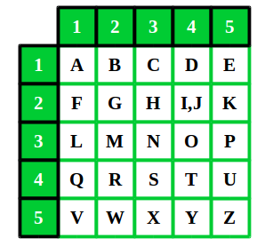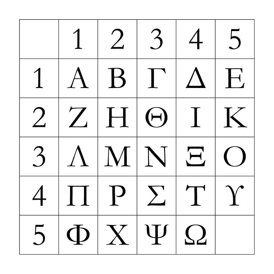 Một phương pháp khác được người Hy Lạp cổ đại sử dụng là hình vuông Polybius. Đây là một lưới gồm năm hoặc năm hoặc sáu x sáu các chữ cái,... Một chữ cái được tham chiếu bởi tọa độ của nó. Chữ cái đầu tiên trong hàng đầu tiên được mã là “11”, chữ cái thứ tư trên hàng thứ hai sẽ được viết là “42”,…