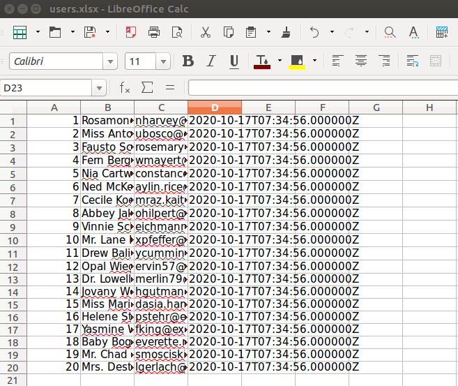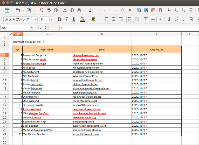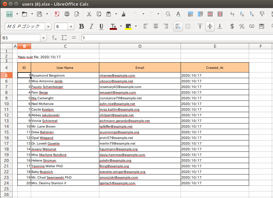 Sau đó truy cập http://localhost:8000/export là có thể download một file users.xlsx về máy rồi. Tuy nhiên file này mình chưa có format định dạng gì nên nó khá là xấu á huhi