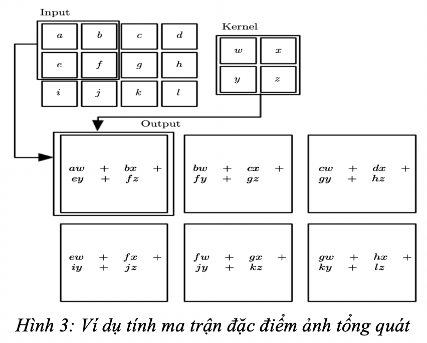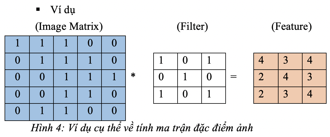 - Từ ma trận ảnh ban đầu đã có và ma trận bộ lọc (kernel) chúng ta tích chập hai ma trận thành một ma trận đặc điểm của ảnh (feature map).
