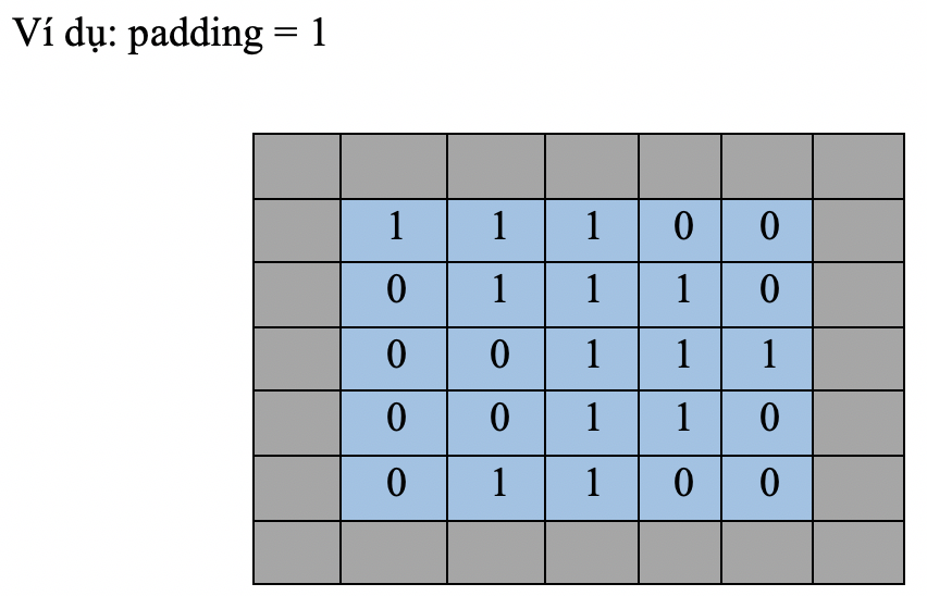 => Đôi khi bộ lọc và stride sẽ không phù hợp ,Để giữ nguyên kích cỡ của feature map so với ban đầu , ta dùng "padding". Khi ta điều chỉnh padding = 1, tức là ta đã thêm 1 ô bọc xung quanh các cạnh của input, muốn phần bọc này càng dày thì ta cần phải tăng padding lên.