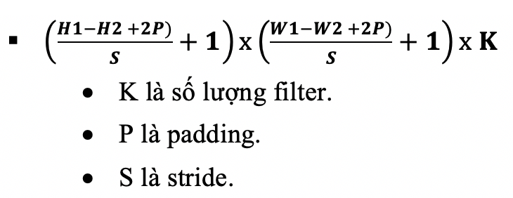 - Ma trận đầu vào có kích thước là H1 x W1 x D (H = height, W = width, D = dimension) và bộ lọc (kernel) là H2 x W2 x D thì ma trận đặc điểm ảnh sẽ là:
