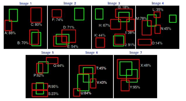 Chúng ta có 7 bức ảnh và giả sử chúng ta chỉ đang xét với 1 class và các hộp màu xanh lá cây tương ứng với gtbox còn hộp màu đỏ tương ứng với predict box của model. Các giá trị % bên cạnh các hộp màu đỏ ứng với confident score của model.