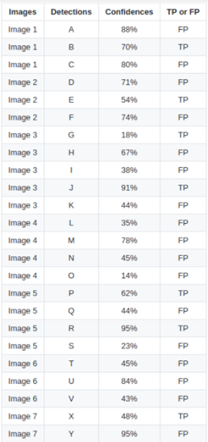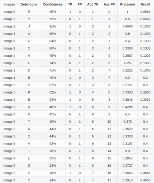 Đầu tiên ta sẽ tính TP và FP như lý thuyết đã nói ở bên trên với ngưỡng iou là 0.3 có nghĩa nếu gtbox và predict box có iou ≥ 0.3 thì sẽ được coi là TP còn không sẽ là FP. Chú ý có thể đối với một gt box có nhiều predict box trùng lặp ví dụ như ở hình số 2 ta thấy predict box D và E đều trùng lặp với cùng 1 gtbox thì khi đó predict box nào có iou score cao hơn thì sẽ là TP còn thằng còn lại sẽ là FP, như trong hình thì D là FP còn F là TP. Từ đó ta sẽ lập được bảng sau: