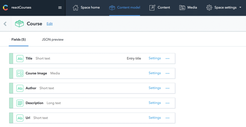 Trước tiên, kết nối với Contentful được thiết lập bằng cách sử dụng thư viện Contentful JavaScript. Để thiết lập kết nối, bạn cần đăng nhập vào back-end Contentful (https://be.contentful.com/login), tạo một space mới, chèn mô hình Khóa học như bạn có thể thấy trong ảnh chụp màn hình sau và truy cập Space ID và Access Token từ cài đặt Space settings — API Keys.