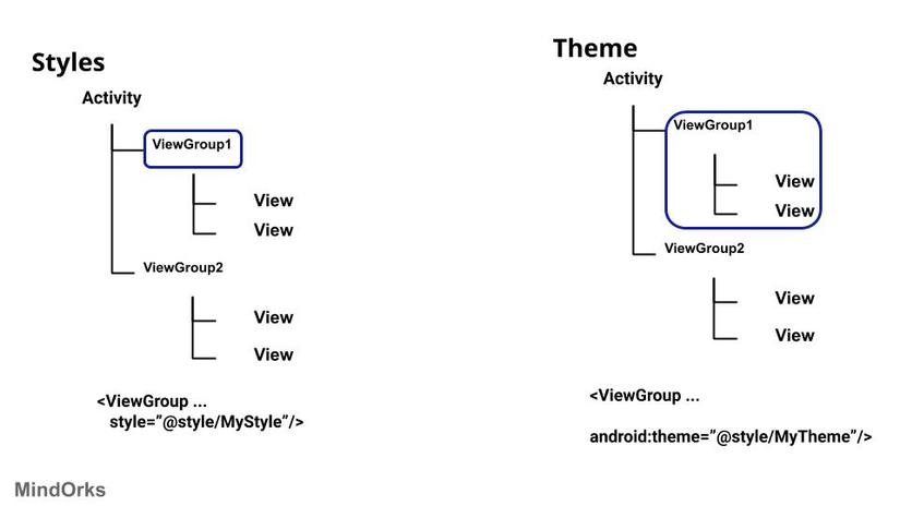 Lý do lớn nhất mà mọi người thắc mắc về styles và themes là với styles chúng ta có <style> nhưng không có <theme> trong Android. Dưới đây là sự khác nhau giữa 2 loại: