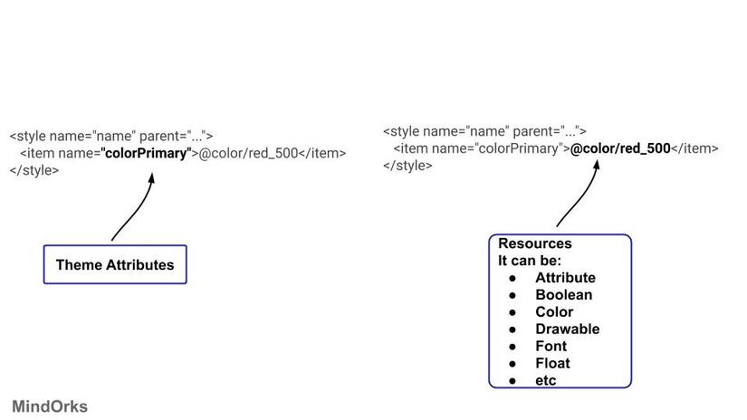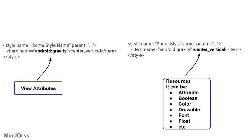 Key-value: Styles như 1 map vì nó có key và value. Vì vậy, ta có view attribute và với các attribute đó, có các value được liên kết theo style. Trong theme, có attribute và value.