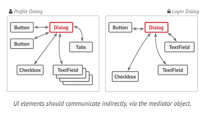 - Mediator thì sẽ trung gian hóa sự giao tiếp giữa các component trong hệ thống. Component chỉ biết về đối tượng mediator và không giao tiếp trực tiếp với các component khác.