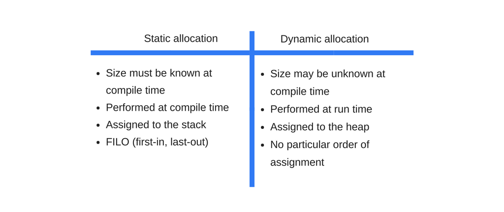 Bởi vậy mà nó không thể cấp phát bộ nhớ cho biến trên stack. Thay vì vậy, chương trình cần hỏi hệ điều hành ở thời gian chạy (run-time). BỘ nhớ được gán từ heap space. Sự khác biệt giữa cấp phát bộ nhớ tĩnh và động được tóm tắt như bảng dưới:
