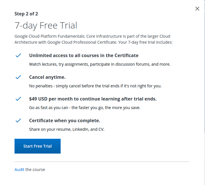 Có 1 mẹo áp dụng cho khá nhiều khóa học trên này. Cơ chế của coursera, 1 số khóa học cho phép audit (xem trước khi học, nó vẫn cho phép mình học như bình thường, chỉ không cấp chứng chỉ, mấy cái đó mình không quan tâm lắm). Khi bạn click vào enroll, thấy cho phép audit là cứ thế học thôi, Mình thấy rất nhiều khóa miễn phí như thế.