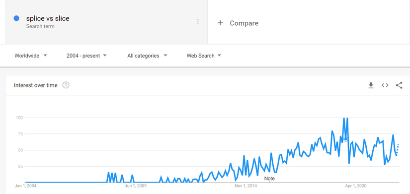 Thống kê từ google trends cho thấy có khá nhiều người quan tâm đến vấn đề so sánh slice và splice. Hai hàm này cũng không có gì quá đặc biệt, nó chỉ là các hàm trong prototype của mảng, được xếp cùng loại với các hàm built-in như map, filter,... nhưng đôi lúc bạn có thể sẽ nhầm lẫn giữ slice (danh từ, đọc là /slaɪs/ ) và splice (động từ, đọc là /splaɪs/ ) hay thậm chí là nhầm với split ( /splɪt/ - chỉ dùng để tách chuỗi thành mảng).
