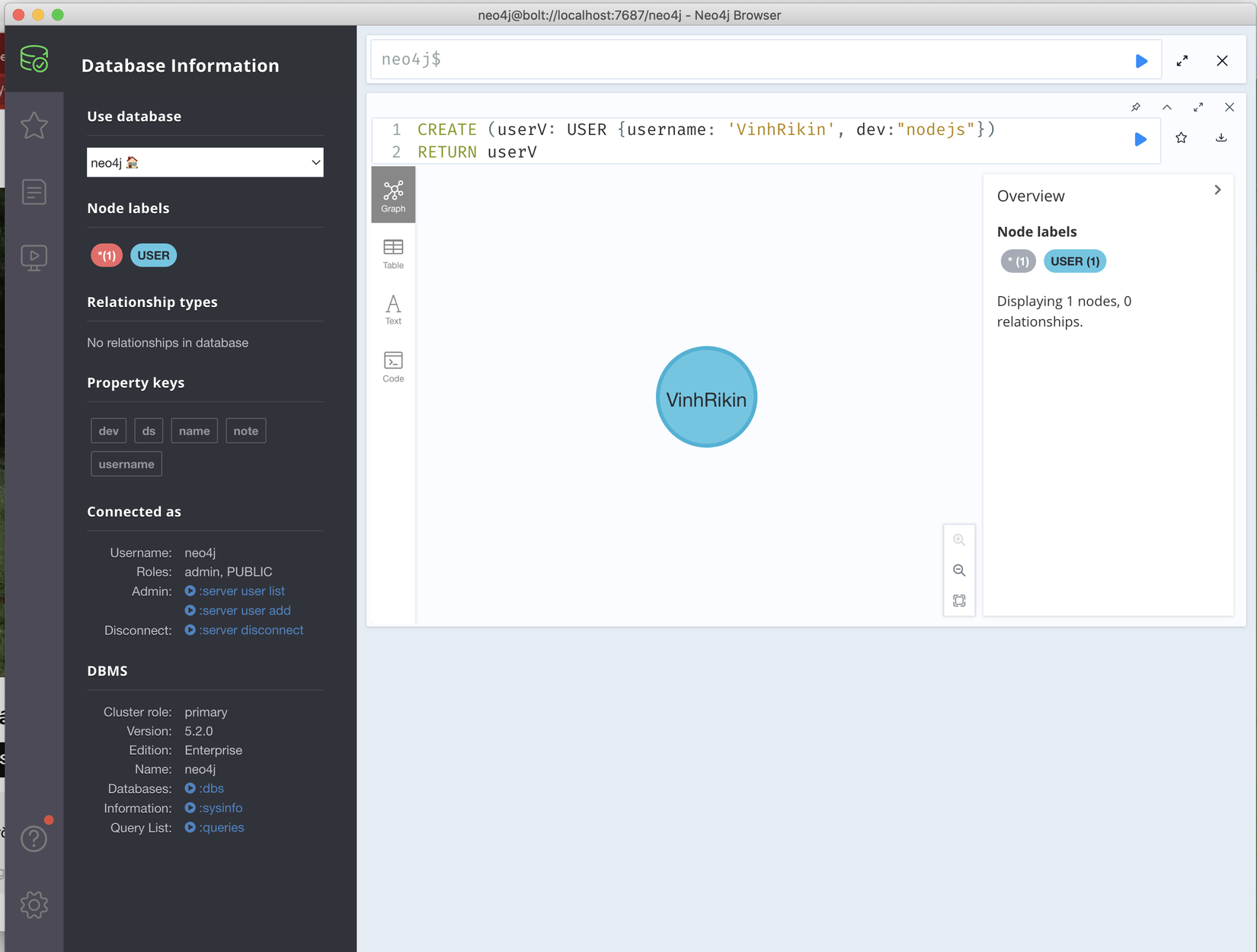 CREATE (userV: USER {username: 'VinhRikin', dev:"nodejs"}) RETURN userV