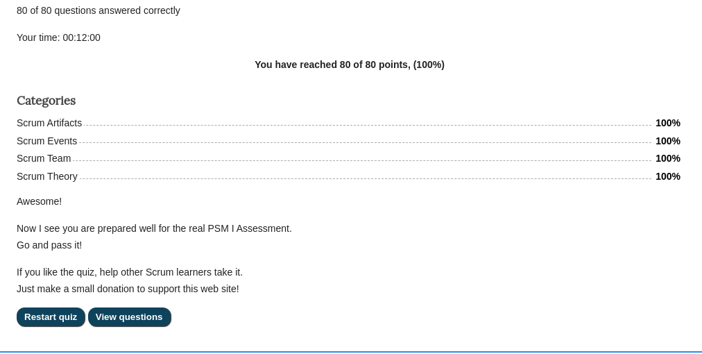 Chốt lại thi PSM1 không hề khó, bạn nên học và thi trong khoảng từ 1-2 tuần. Đừng nên kéo dài vì sẽ gây loãng, nhanh quên, dù sao nó cũng tràn đầy tính lý thuyết nếu bạn chưa áp dụng scrum trong dự án hoặc áp dụng nhưng chưa chuẩn