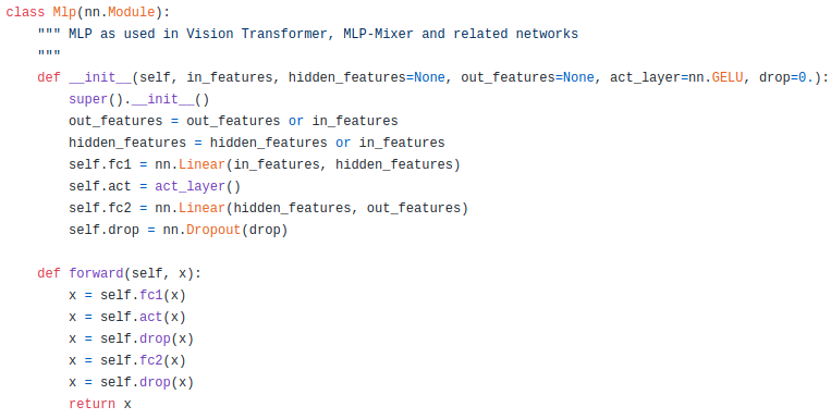 Cuối cùng, thành phần nhỏ nhấn được thể hiện trong hình minh họa là các khối MLP. Chúng được cấu tạo bởi hai lớp fully-connected và một hàm kích hoạt phi tuyến tính được áp dụng độc lập cho mỗi hàng của tensor dữ liệu đầu vào cụ thể là hàm GELU có công thức là . Mã cài đặt của chúng được thể hiện trong hình dưới đây: