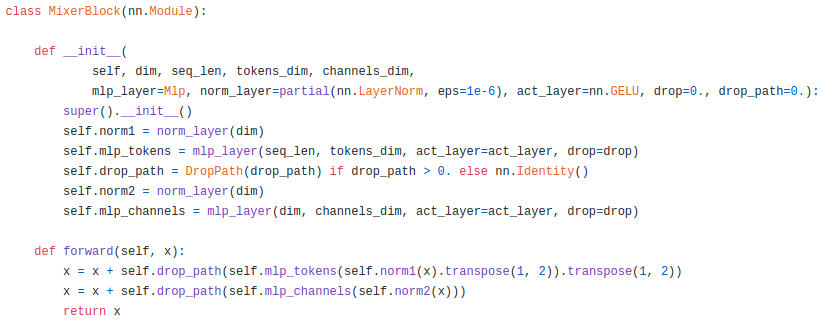 Phần mã dưới đây thể hiện cách thức cài đặt của MixerLayer. Có thể thấy rằng cấu trúc của MixerLayer được cài đặt đầy đủ trong class MixerBlock (không giống như repo nào đấy của Yolov4 treo đầu dê bán thịt chó, trong paper có PAN mà tìm không thấy đâu) khi mà mỗi MixerBlock có hai LayerNorm trước mỗi lớp MLP cũng như cài đặt mã phục vụ cho quá trình skip-connections .