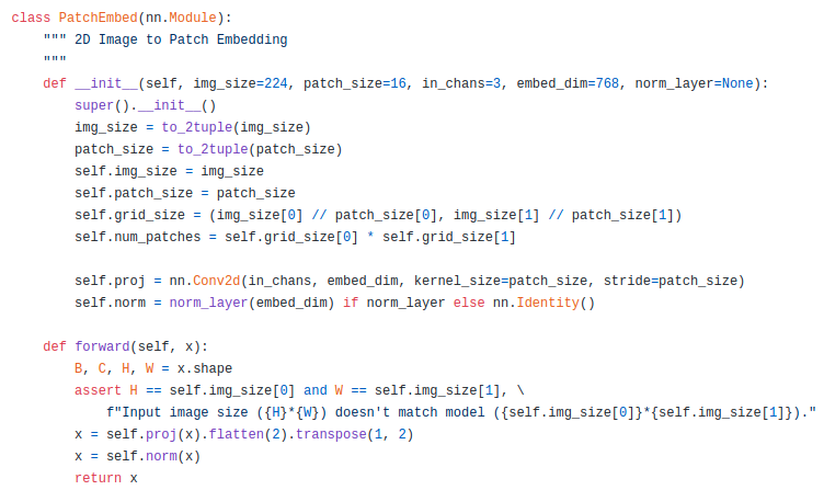 Hình minh họa trên được trích từ paper mô tả tổng quan kiến trúc của Mixer. Kiến trúc này nhận đầu vào là một chuỗi các phần của hình ảnh được chiếu tuyến tính (được đề cập trong paper với khái niệm token) như một bảng có kích thước là . Như trong hình minh họa trên đang thể hiện kiến trúc của một mô hình phân lớp, hình ảnh đầu vào được chia thành 9 phần tương ứng với 9 token là đầu vào cho mạng. Để hình dung rõ hơn, ta hãy cùng quan sát phần mã Pytorch được cài đặt cho phần PatchEmbed ở repo pytorch-image-models được thể hiện ở hình dưới đây.