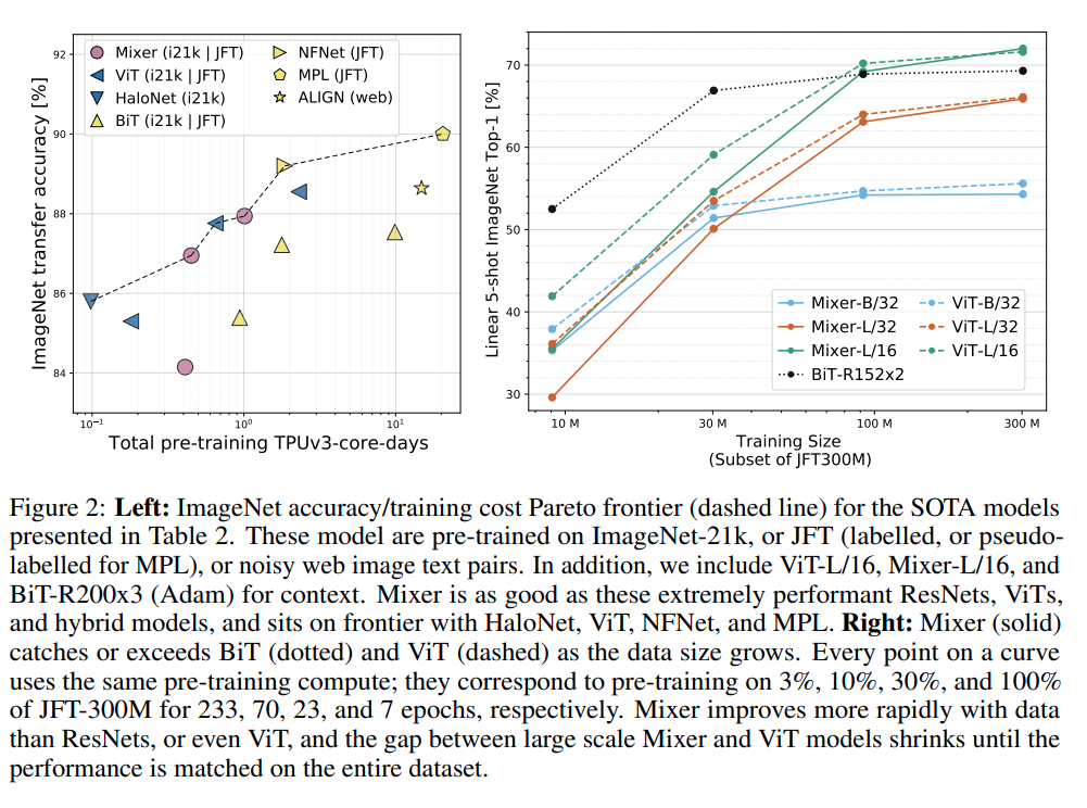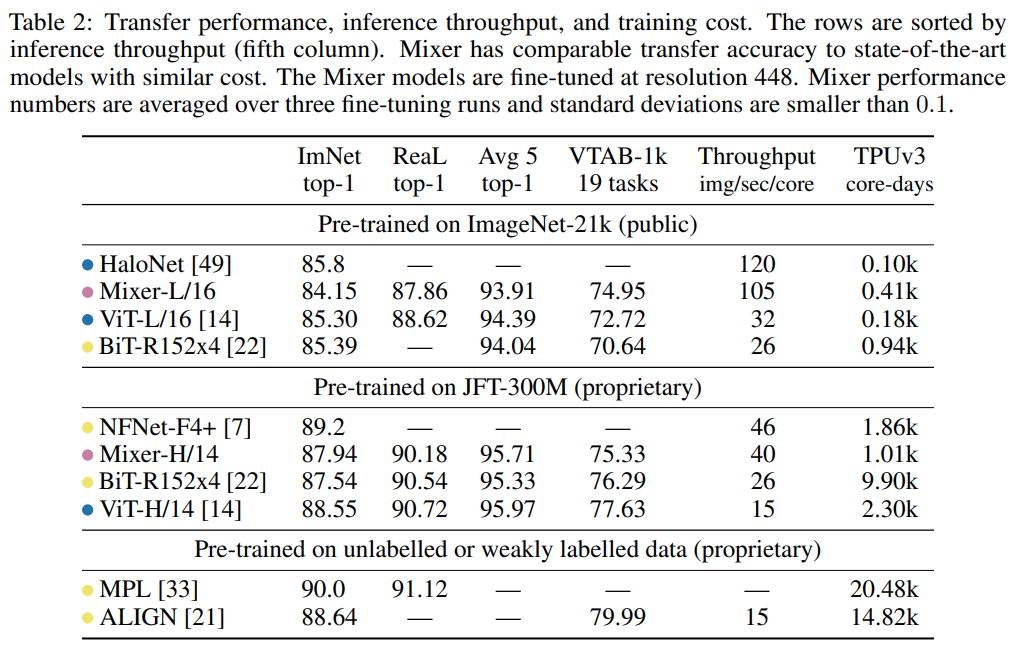 Khi kích thước của tập dữ liệu tăng lên, hiệu suất của Mixer sẽ cải thiện đáng kể. Đặc biệt, Mixer-H/14 đạt độ chính xác top-1 là 87,94% trên ImageNet, tốt hơn 0,5% so với BiTResNet152x4 và chỉ thấp hơn 0,5% so với ViT-H/14. Đáng chú ý, Mixer-H/14 chạy nhanh hơn 2,5 lần so với ViT-H/14 và gần như gấp đôi BiT.